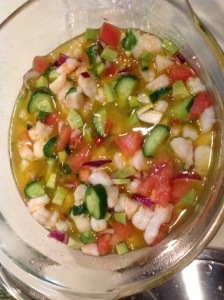 Everything was really good, and shockingly the shrimp cirviche won out over all the other kinds. Shocking, because at first none of us liked it. But by the second round we were really appreciating the subtle flavor melding. To make it, you simply chop two pounds of shrimp and add 1/2 C of red onion, 1 C of cucumber and the juice of a couple oranges, lemons, and limes. Let it sit at least an hour in the fridge, where the acid from the juice actually “cooks” the shrimp. (If you’re worried about bacteria you can bring some water to a boil, throw the shrimp and immediately turn off the heat. Let it sit three minutes. Then follow the previous direction)