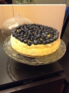 The cheesecake was pretty traditional in the first layer, with a little lemon zest. It was topped partway through with sour cream and a bit of sugar. After it cooled, I added blueberries and a lemon glaze.