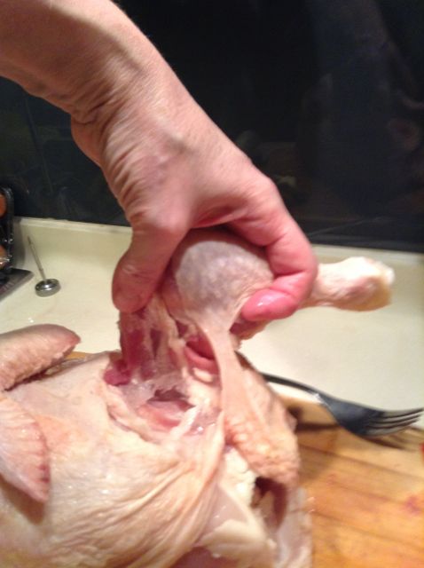 If you get your chicken whole and thawed, it’s easy to break into pieces yourself. Of course you can bake the whole chicken, which is delicious. But if you want your thighs, wings and breast separate, and still have some lovely bones to make soup with, it’s cheaper to cut off your own chicken breasts than letting the store do it and charge you for the service. At least it is here.